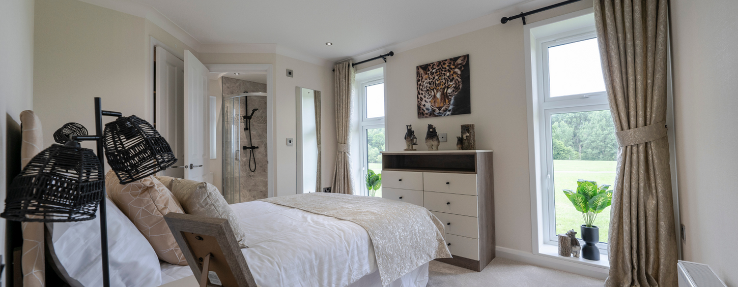 spacious bedrooms offer comfort and convenience. The master bedroom includes a double bed, large chest of drawers, walk-in wardrobe, and a shower en-suite. Bedroom 2 includes a double bed with fitted wardrobes, and the Stately-Albion Wentwood also has a study.