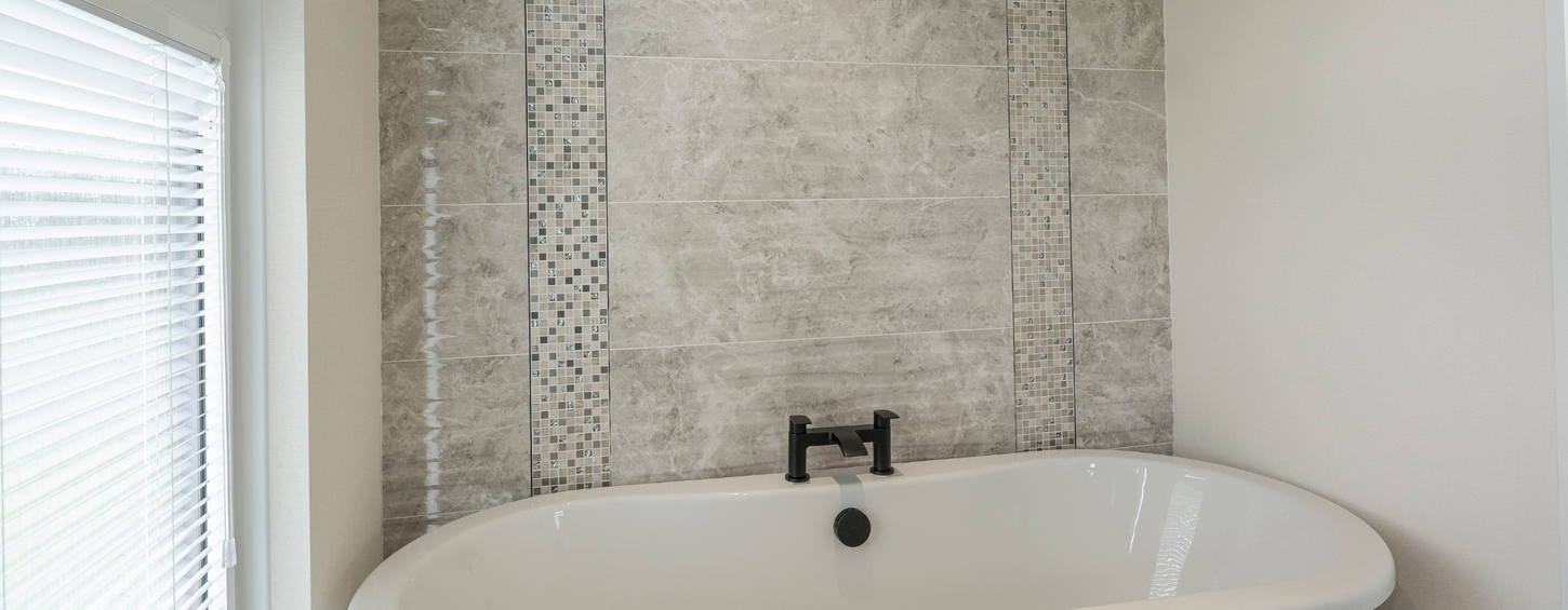 Our luxurious bathroom features a luxury roll-top bath with chrome feet against a fully tiled mosaic wall, with the remaining walls and floor tiled in beige. Glossy white units and sideboards complement the neutral colour palette and provide plenty of extra storage space.